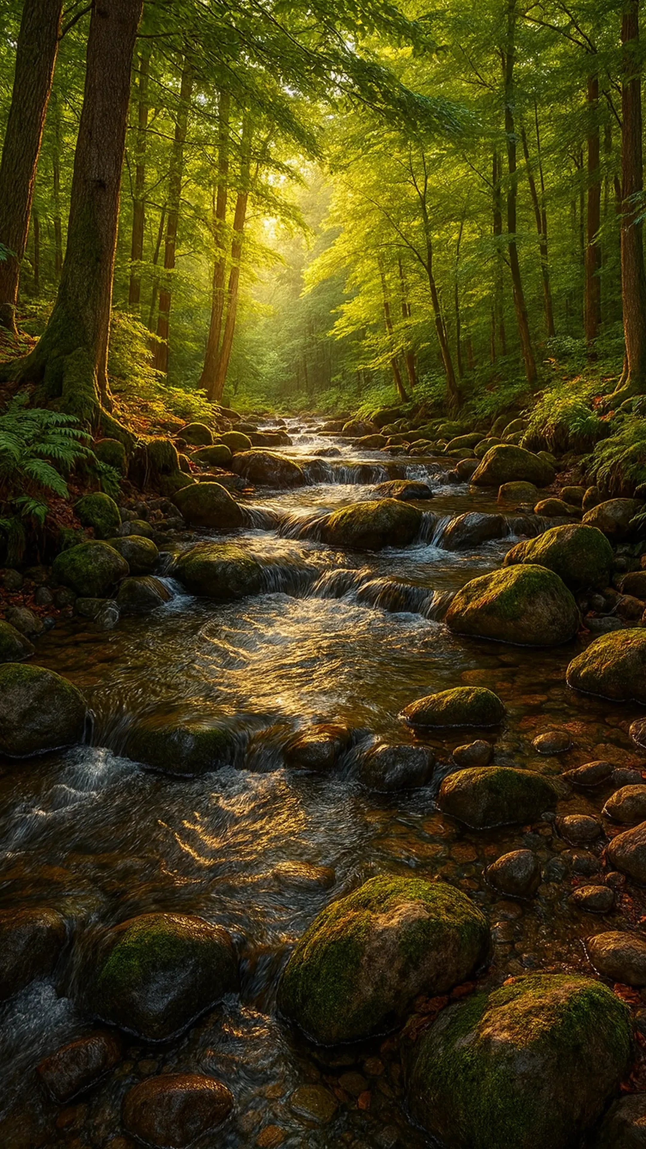 Warm sunlight filters through the forest canopy, reflecting gently on a clear stream as it flows over smooth stones covered in soft green moss. Tall trees frame the water, creating a peaceful natural passage that defines the calm mood of this forest wallpaper.